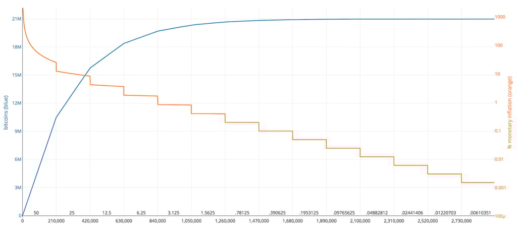 Сатоші Накамото вирішив, що новостворений запас біткойнів поповнюватиметься через майнінг доти, доки не буде досягнуто ліміту в 21 мільйон монет. Ці біткойни розподілятимуться за суворим набором правил. Одне з правил свідчить, що винагорода за блок скорочуватиметься вдвічі кожні чотири роки, поки не буде здобутий останній Біткойн. Іншими словами, інфляція біткой на кожні чотири роки знижуватиметься вдвічі.